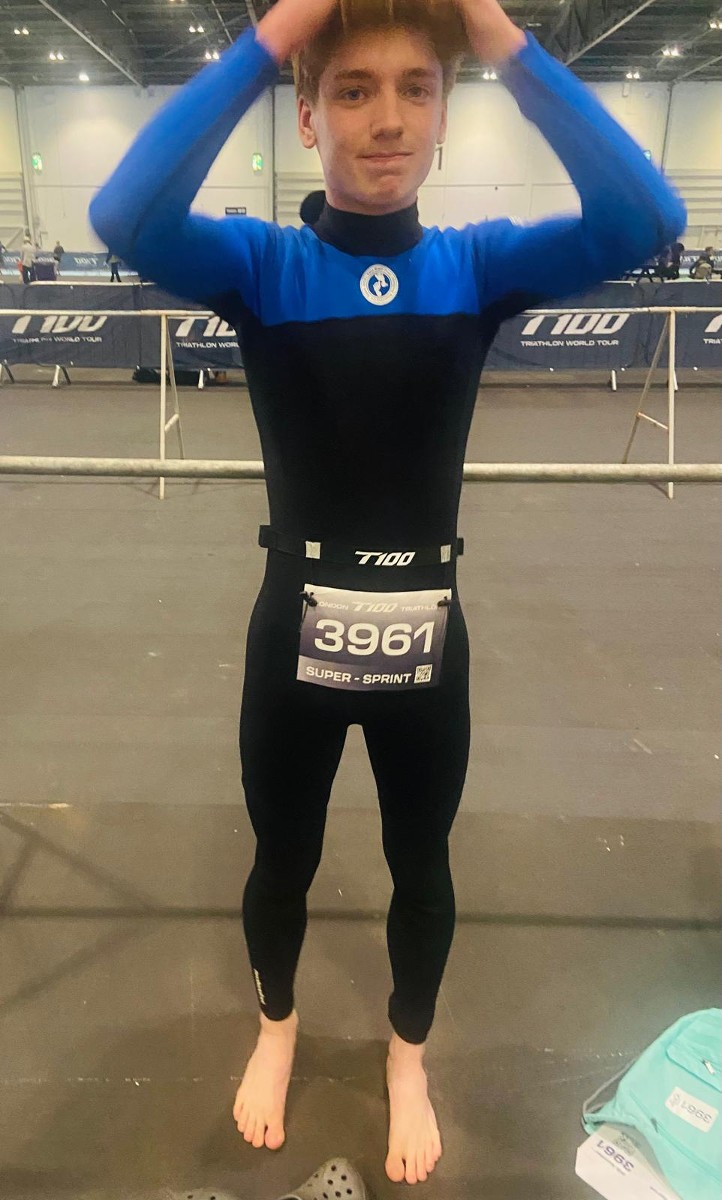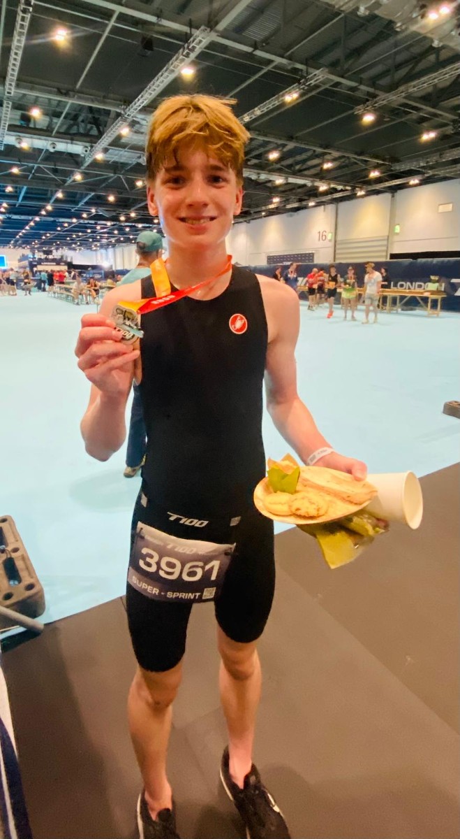 On August 9th, 15-year-old Reiss Smith took on the London Super Sprint Triathlon, consisting of a 400m swim, 10km bike, and 2.5km run. Reiss delivered an impressive performance, emerging from the swim in first place with a time of 5:40. He went on to complete the bike and run segments with times of 22:32 and 10:53 respectively, finishing with a total time of 47:18, ultimately securing 2nd place in his age group.